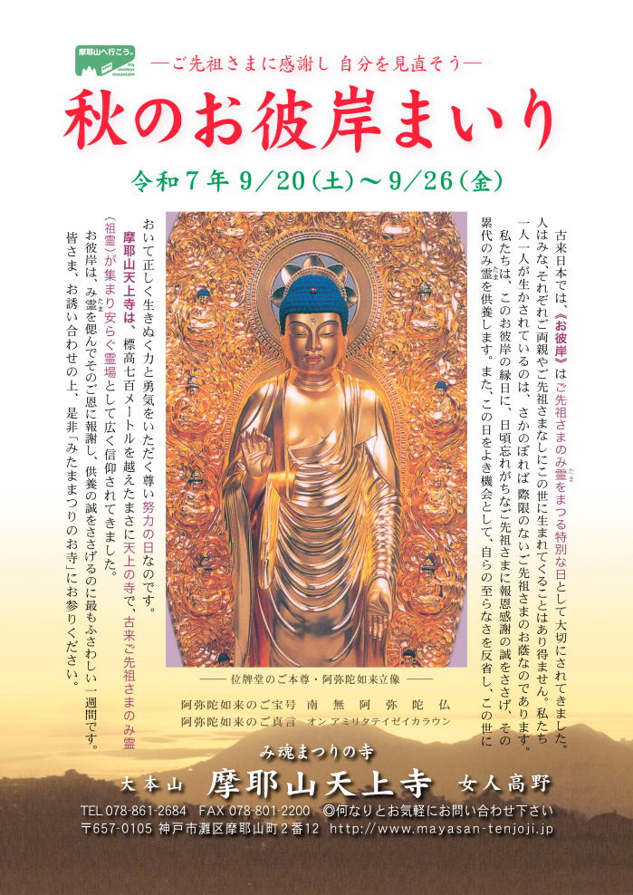 ◎法道仙人祭 平成30年10月18日 午前11時〜 場所:摩耶山天上寺 法道仙人石像前 内容:摩耶山を開山した法道仙人の遺徳をしのび、そのご加護を願います。 ![]() |
