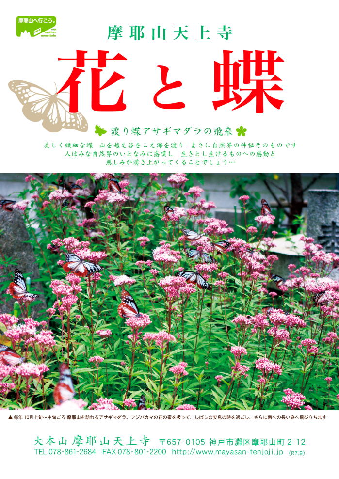 ◎令和7年秋 アサギマダラの飛来![]() ![]() 開花状況・蝶の飛来数など 2025.9.22 アサギマダラ初飛来。2匹の目撃情報あり。フジバカマはまだほとんど花が開いていない。 2025.9.23 アサギマダラ1匹の目撃情報あり 2025.9.27 天空の舞台下に3匹見られた。延命地蔵尊前に時々1匹飛来。フジバカマはまだ咲きはじめ。 2025.9.29 舞台下に1匹、延命地蔵前には2匹。フジバカマ開花すすみ、延命地蔵尊前では4本に1本 くらい咲いているか。 2025.9.30 晴天。朝急に肌寒くなってきた。午前10時頃の外気温19.5度。 蝶は延命地蔵尊前に6匹、舞台下に5匹くらい、トイレすぐ横に5匹。だんだん増えてきた。 午後3時頃にはあたたかくなり、各所蝶が朝の倍くらいになっていた(トイレ横で10匹ほど)。 境内全体では、50匹くらいいたよう。 ※ 今年摩耶山はヘビが多く、マダニも灘区のあちこちで確認されています。安全な場所で 蝶をご覧ください。 2025.10.1 晴天。夕方4時頃、延命地蔵尊前で40匹くらい、トイレ横で20匹くらい。 花は開花が進んできてきれいで、撮影によいコンディションだと思う。 2025.10.2 晴天。気温もちょうどよい(14:30に 受付で21.5度)。昼頃、延命地蔵尊前で50匹以上、 トイレ横に20匹くらい、舞台下に20匹くらい。 トイレ下のバックヤードの畑は今年はフジバカマの花が病気で全滅。その周辺や川沿いに 株分けされた花はあるが、点在している感じ。 その分、延命地蔵尊前とトイレ横に蝶がたくさん集まってきている。 今日は、境内全体の蝶を合わせると、200〜300匹くらいだろうか。 西山門付近には、キイジョウロウホトトギス(朝ドラ「らんまん」に登場した植物)が石垣に 生えている。150本ほど葉が垂れているうち、先端の花が咲きはじめたのが12本くらい。 つぼみはふくらんできたが、青いどんぐり状〜オオハシのくちばし状。全体的には、花は ぱっと見てまだ目立たない感じ。 2025.10.3 朝10時頃から小雨。ぽつぽつとした雨の中、蝶は蜜を飲んでいるが、もう少し雨が 強まれば、森に隠れてしまうかもしれない。 午前10:30の受付の気温は20度。 花の開き具合と蝶の増え方からみて、これから5〜7日間くらいが飛来のピークでは ないかと思う (※ ピーク時でも、雨の日は蝶の数が減ります)(ピークを過ぎると 蝶の数は減っていきますが、10月20日を過ぎても数匹見られることもあります) 午後2時。雨は「ぽつぽつ」→「ぱらぱら」→「しとしと」という感じで、だんだん強まって きたが、蝶は朝いちばんよりも増えて、金堂前で50匹くらい、トイレ横に20匹くらい いる。 人間も傘をさすような雨だが、蝶は懸命に蜜を吸っている。夜の寒さに耐えて 旅を続けるために、何とかエネルギーを蓄えようとしているのだろう。 2025.10.6 一昨日と昨日は小雨だったが、蝶はまぁまぁ見られたそう。今日は快晴だが、正午でも ピーク頃にしては少ない。 雨の翌日の午前はいつも少ないので、 羽根をかわかして、 午後には増えるだろうか。 見る人が急に増えたので、蝶が人の多いところから逃げて いることもあるかもしれない。ただ、今は青空なので、羽根も青く見える時があり、うまく すれば蝶をきれいに撮れるかもしれない。 キイジョウロウホトトギスは週末に花が一気に開いたようで、今日は花がたくさん黄色く 咲いていて、見頃に入っていた。 2025.10.7と10.8 は雨だったよう 2025.10.9 今朝は快晴。台風の影響か風が少し強いが、蝶は来ている。蝶を見に来られている 方が多く、蝶の数を数えにくいが、金堂前で少なくとも30匹はいると思う。 境内全体では、人が立ち入れないところや点在している場所も含めて、300匹以上は きている。もっと多くきているのかもしれない。 2025.10.10 今朝は快晴。朝10時半で、金堂前にぱっと見て30匹以上はいる。 蝶観察のコンディションとしては良い日だが、今日天上寺では断水工事を行っており、 トイレ使用に若干ご不便をお掛けしています(時々寺の者がタンクにバケツで給水に 行きます)。(断水工事は2時半くらいに終了しました) 夕方、トイレ横の蝶の数がとても多いと感じた。キイジョウロウホトトギスは見事に満開。 2025.10.11 今朝9時半、金堂前(延命地蔵尊まわり)のフジバカマに、沢山の蝶が来ている。 ぱっと見て100匹以上いそうな感じ。人が近づくと舞い上がり壮観。今が本当の ピーク という感じ。境内全体ではどれだけいるのだろうか。数百匹来ているだろう。 表六甲ドライブウェーから天上寺に向かう車内からも、蝶が何匹か見られたので、 山上にはいま沢山の蝶が来ていると思う。 蝶を見にくる人も多いので、蝶は頻繁に舞い上がっています。蝶をあまり驚かせず、 ゆっくり吸蜜している姿も見守ってあげてください。 朝9時50分、小雨が降り出した。台風が近づいているからか。蝶は雨でも離れず 蜜を吸っている。 午前11時 雨があがり晴れてきた。山の天気は変わりやすい。蝶はたくさんいる。 2025.10.12 朝9時 曇り。蝶はたくさん来ている。金堂前で50匹〜100匹、トイレ横で30匹くらい。 
