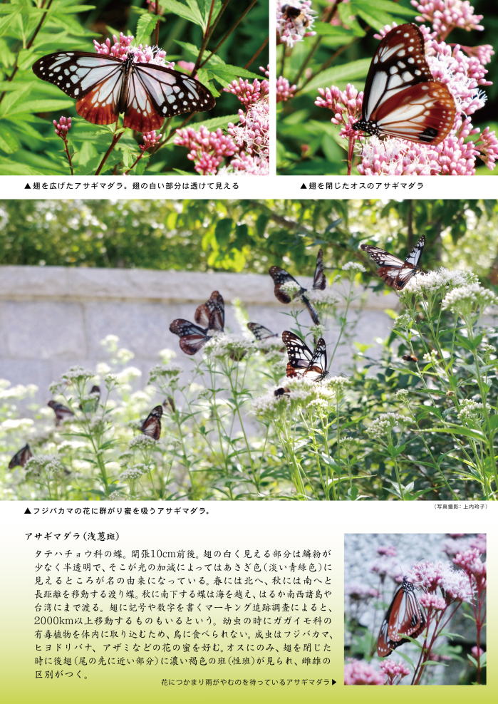 令和4年 渡り蝶アサギマダラの飛来 例年10月上旬〜中旬にかけて、渡り蝶アサギマダラが天上寺境内に飛来します。 (昨年は10月4日〜10日頃がピークでした)) 飛来のピークの時期は年により変わります。飛来の状況等、お気軽にお問い合わせください。 (摩耶山天上寺 電話078−861−2684) 【飛来状況】 9月24日 フジバカマが開花しはじめる 2匹確認 9月26日 6〜7匹確認 10月1日 目測で100匹以上。境内全体では200匹はいると思われる 10月3日 花は3分咲きくらい。多数の蝶が飛来している。境内全体で2〜300匹か 10月4日 花は4分咲きくらい。雨が降りそうな曇天だが、境内全体で200匹はいると思われる 10月5日 花は5〜7部咲きくらい。今日はロープウェーが運休になる強風で、蝶の姿が見えない。 朝2匹確認 10月6日 花は6〜7部咲きくらい。昨日の強風と急な気温低下のためか、朝は2匹しか確認できず 10月7日 雨 10月8日 晴。数十匹は飛来していたそう 10月9日 午後は雨 10月11日 晴。花は9分咲き〜満開。朝10時には外気温13度で、蝶は全く見られず。 昼1時すぎに3〜4匹見られ、その後10〜15匹まで増えたそう 10月13日 晴。花は満開。朝9時の時点では、気温16.5度、日差しがあたたかく、蝶は10匹くらい。 10月14日 晴。今朝はあたたかく朝11時で気温19度、境内全体で20匹以上はいそう |